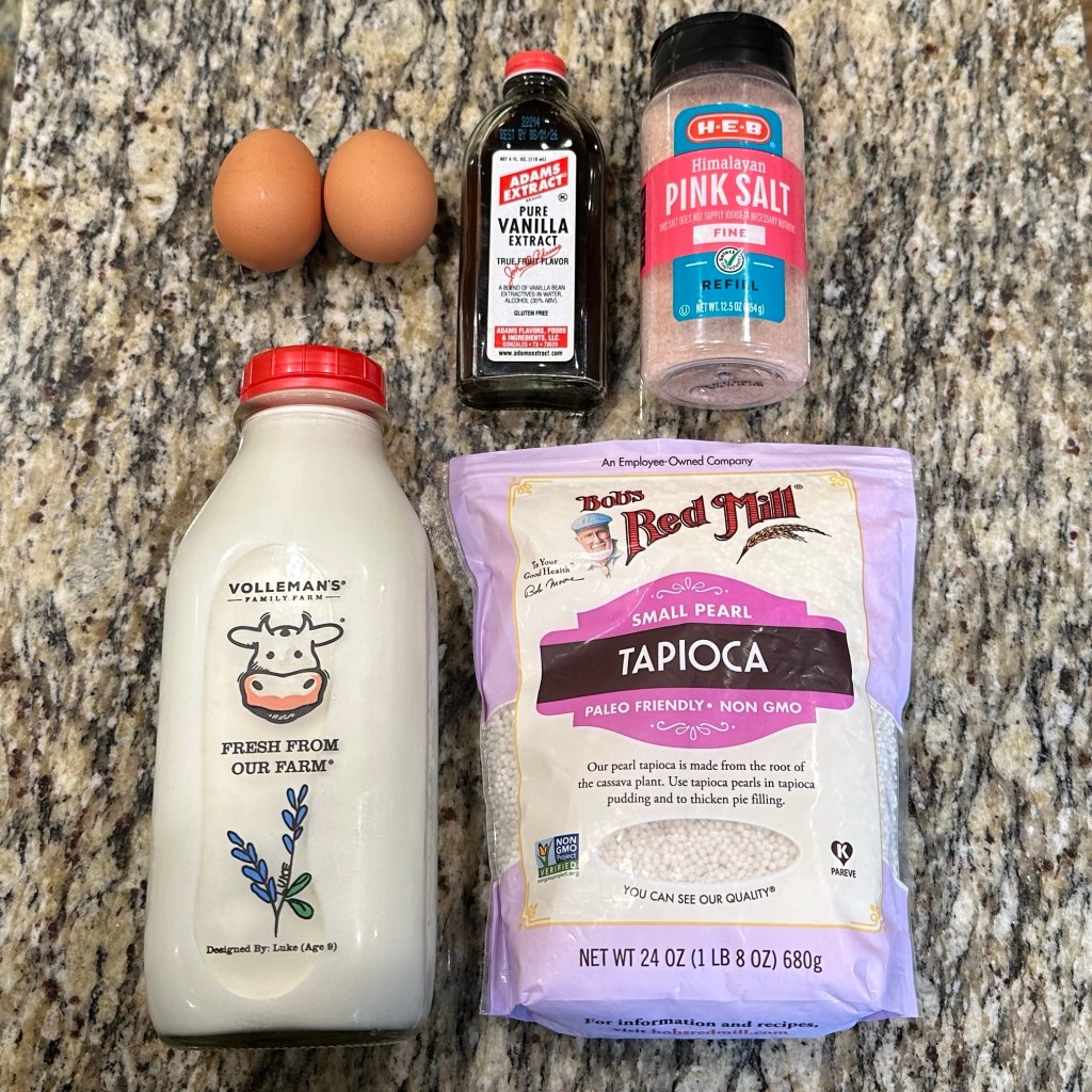 Gather your ingredients: I have some eggs, vanilla, salt, whole milk, and small pearl tapioca. Not pictured, the sugar.