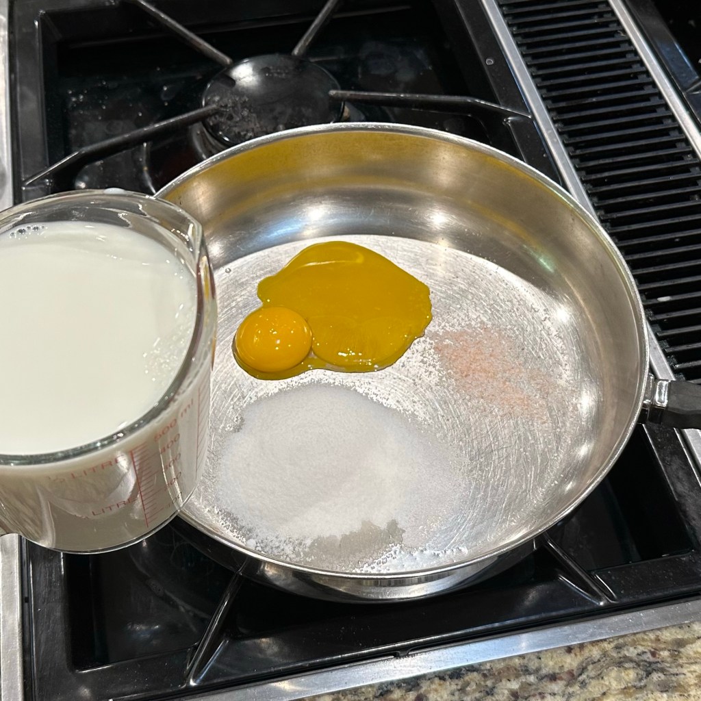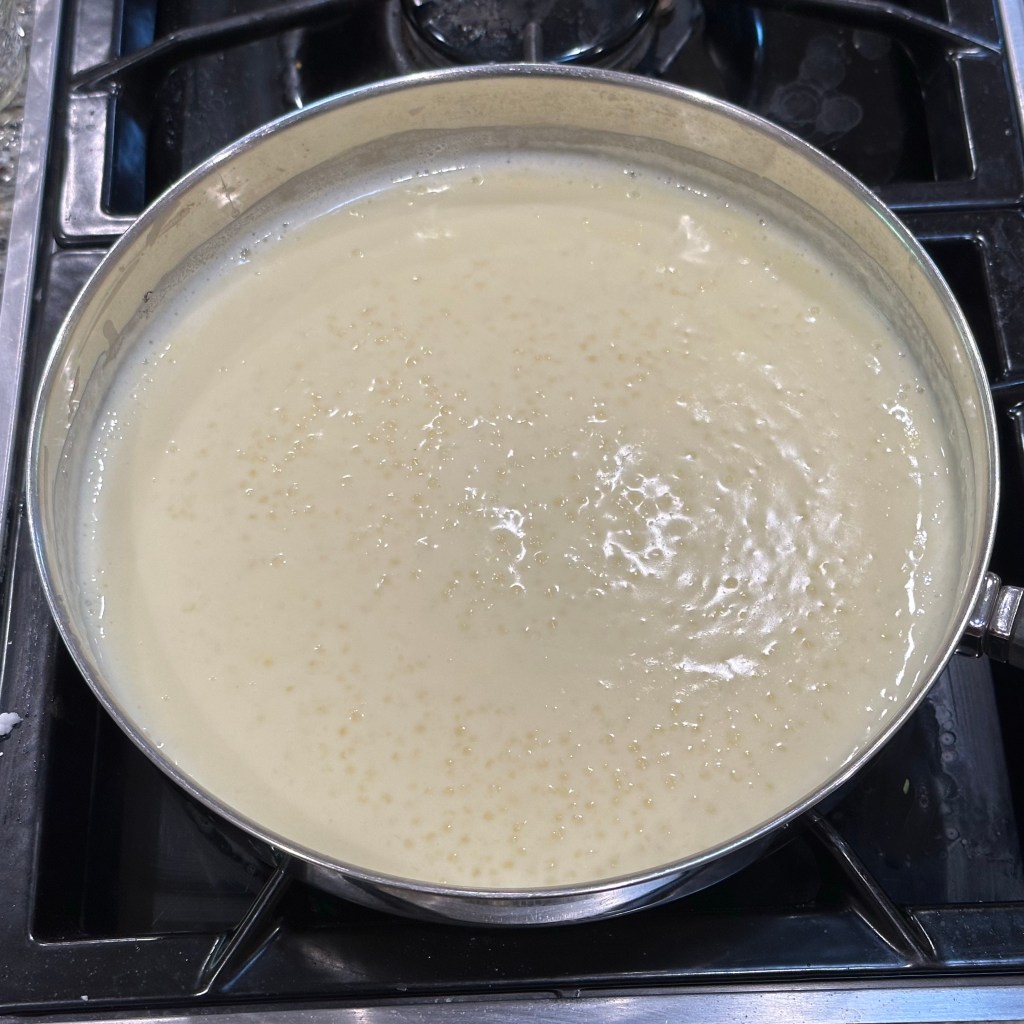 I loosely followed the recipe on the bag of tapioca pearls from Bob’s Red Mill. I really do not remember folding egg whites into it but maybe? Either way it is delicious. Highly recommend.
